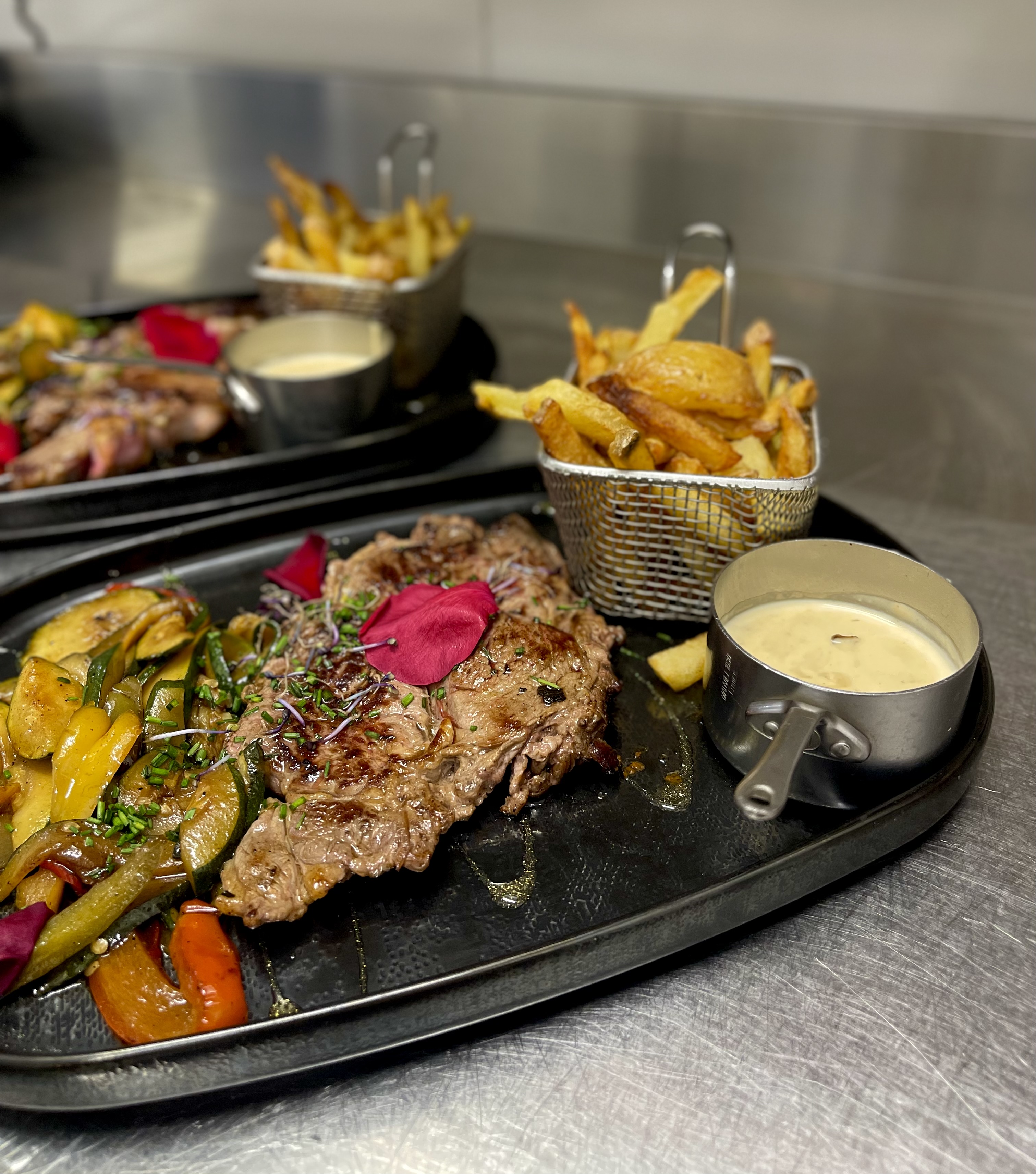 accompagné de risotto, purée de pommes de terre maison et légumes du moment & trois sauces au choix