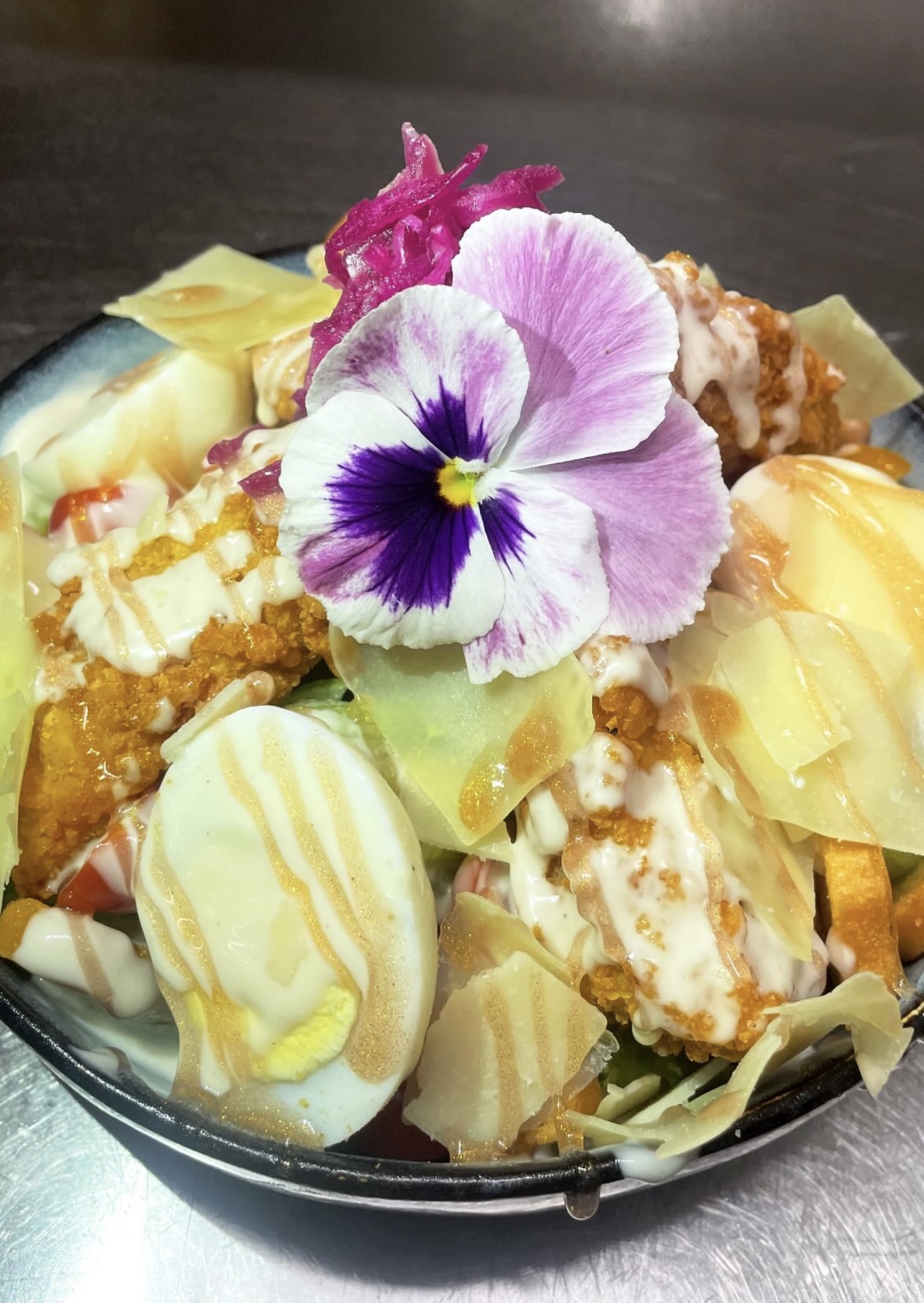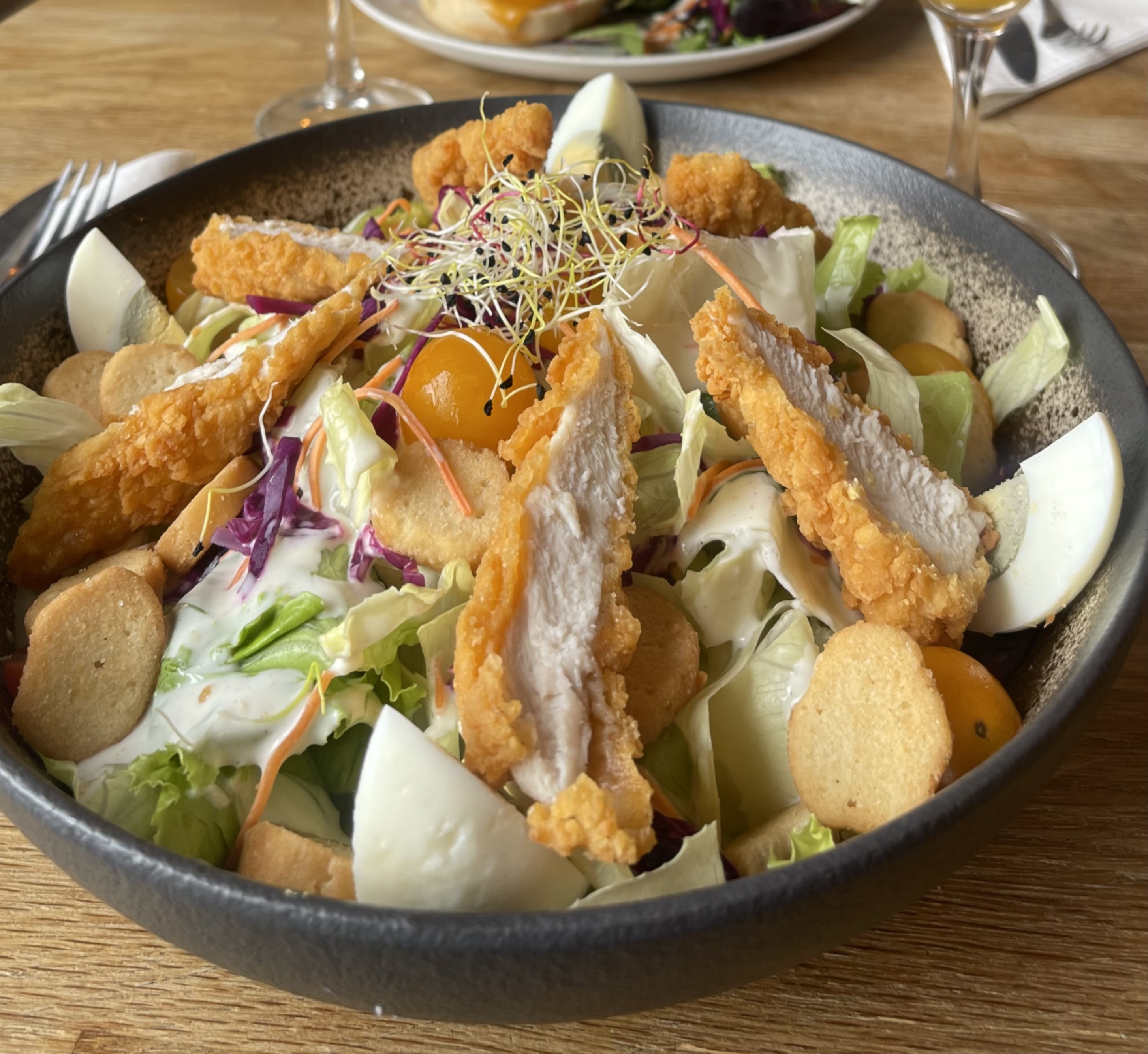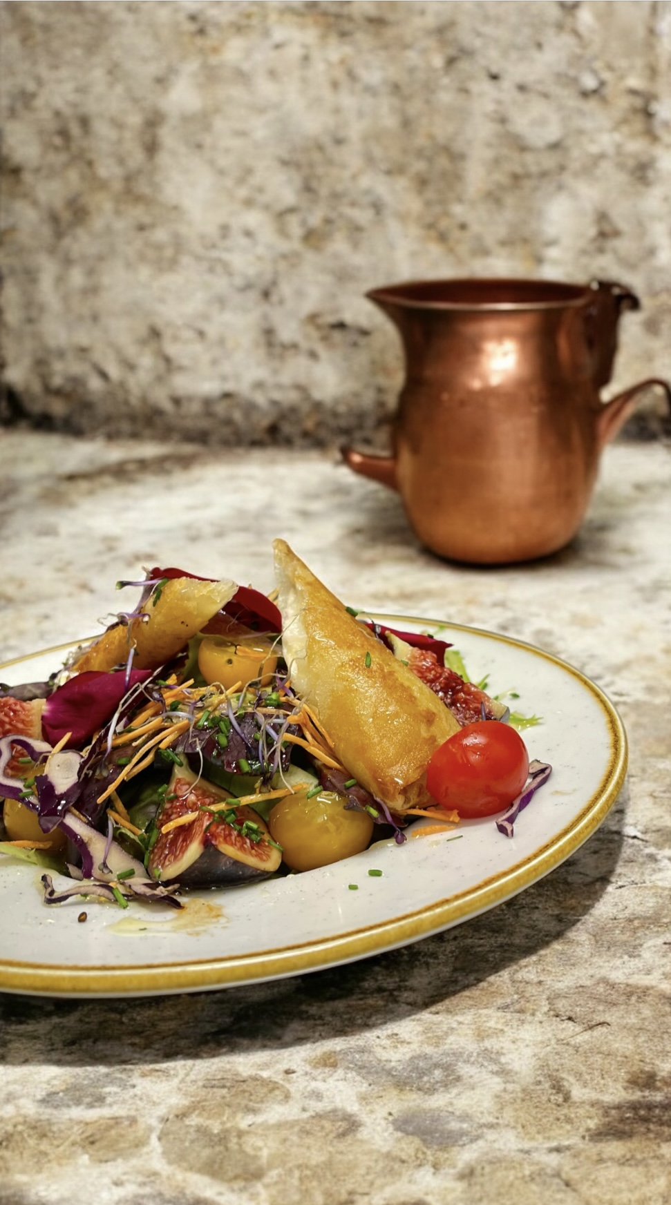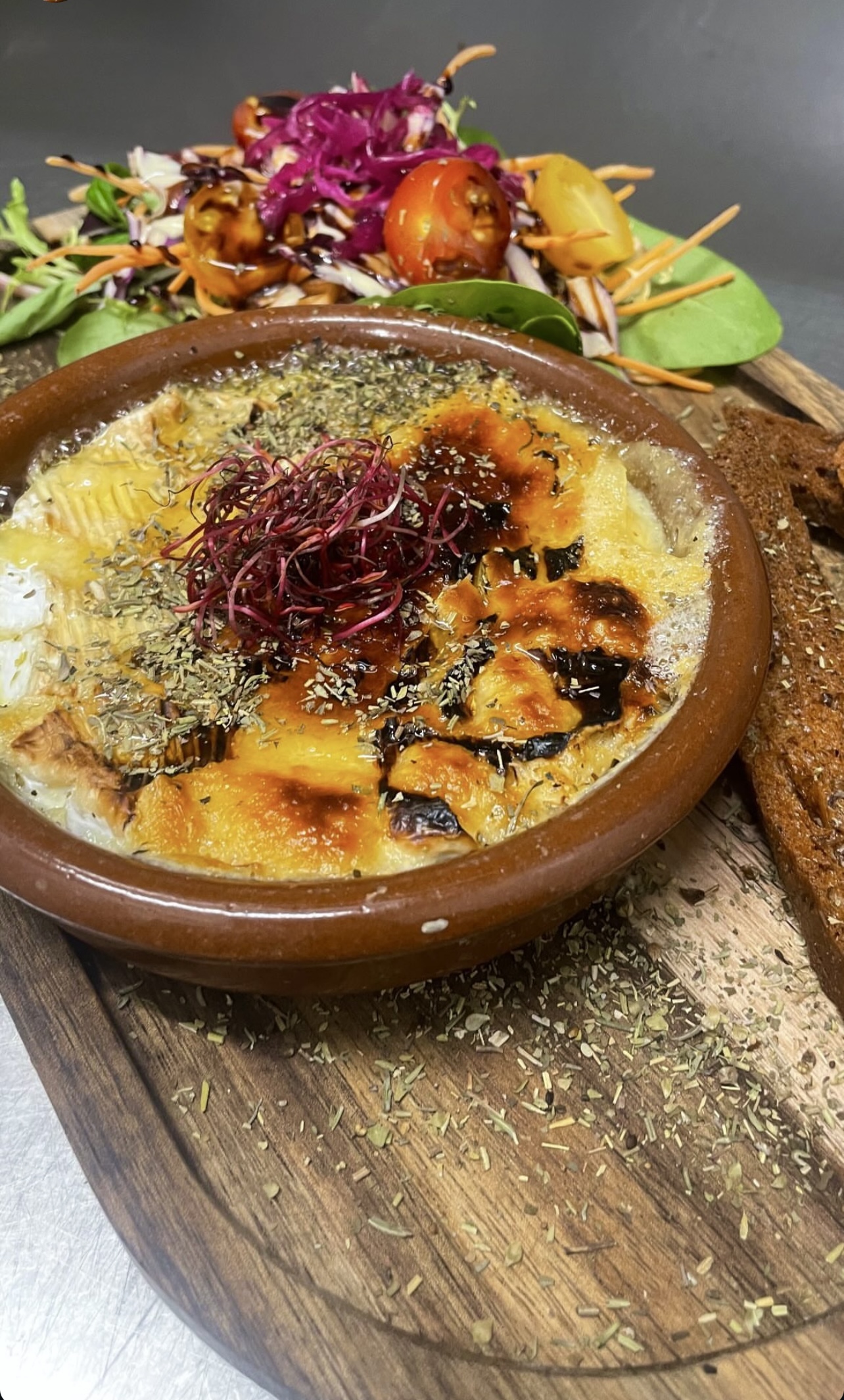 Salade, camembert rôti au miel, charcuterie, croutons aux herbes de Provence, pommes de terre grenaille